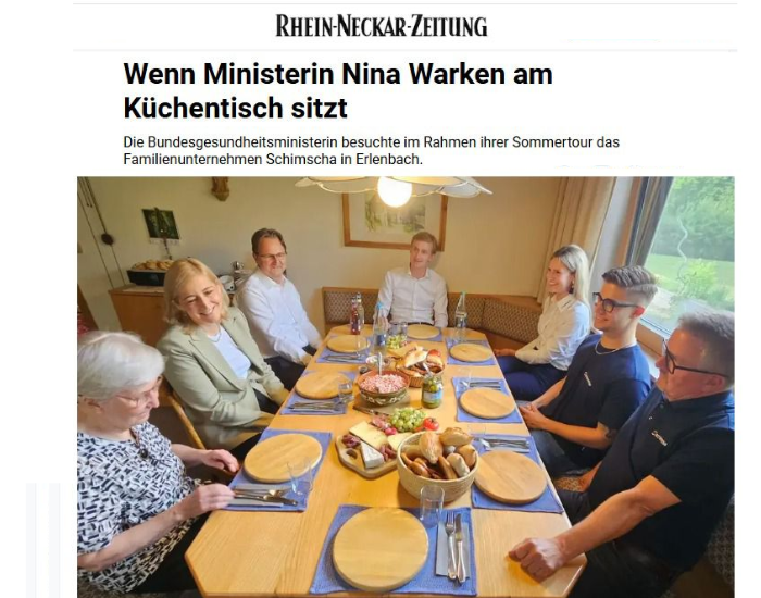 „Wir als Familie kommen hier täglich zum gemeinsamen Frühstück und Mittagessen zusammen. Dabei sprechen wir über Investitionen, treffen wichtige Entscheidungen, lachen herzlich – und manchmal fließt auch eine Träne. Frau Warken wollten wir mit der Einladung zur Brotzeit einen authentischen Einblick geben in das, was uns als Familie und als Familienunternehmen ausmacht“, sagte Katrin Schimscha.