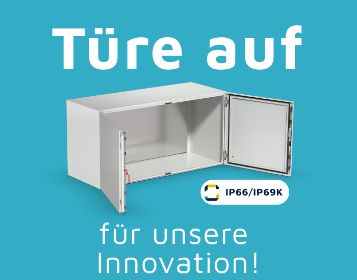 Dank unserer neu entwickelten Türkonstruktion kommt unsere Produktinnovation künftig komplett ohne Mittelsteg aus. Das ermöglicht den Einsatz einer großen, durchgängigen Montageplatte, bietet beste Zugänglichkeit und garantiert eine Dichtigkeit bis IP69K.